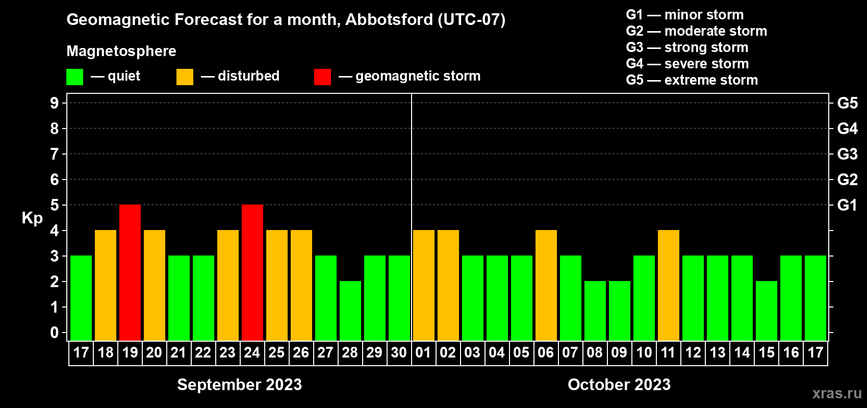 Geomagnetic storm forecast in Abbotsford for Sep 17, 2023