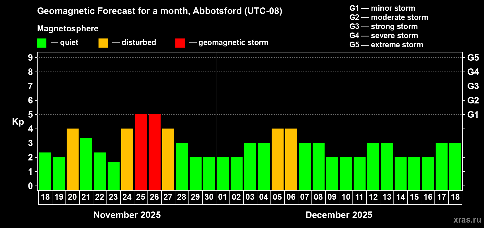 Geomagnetic storm forecast in Abbotsford for Nov 18, 2025