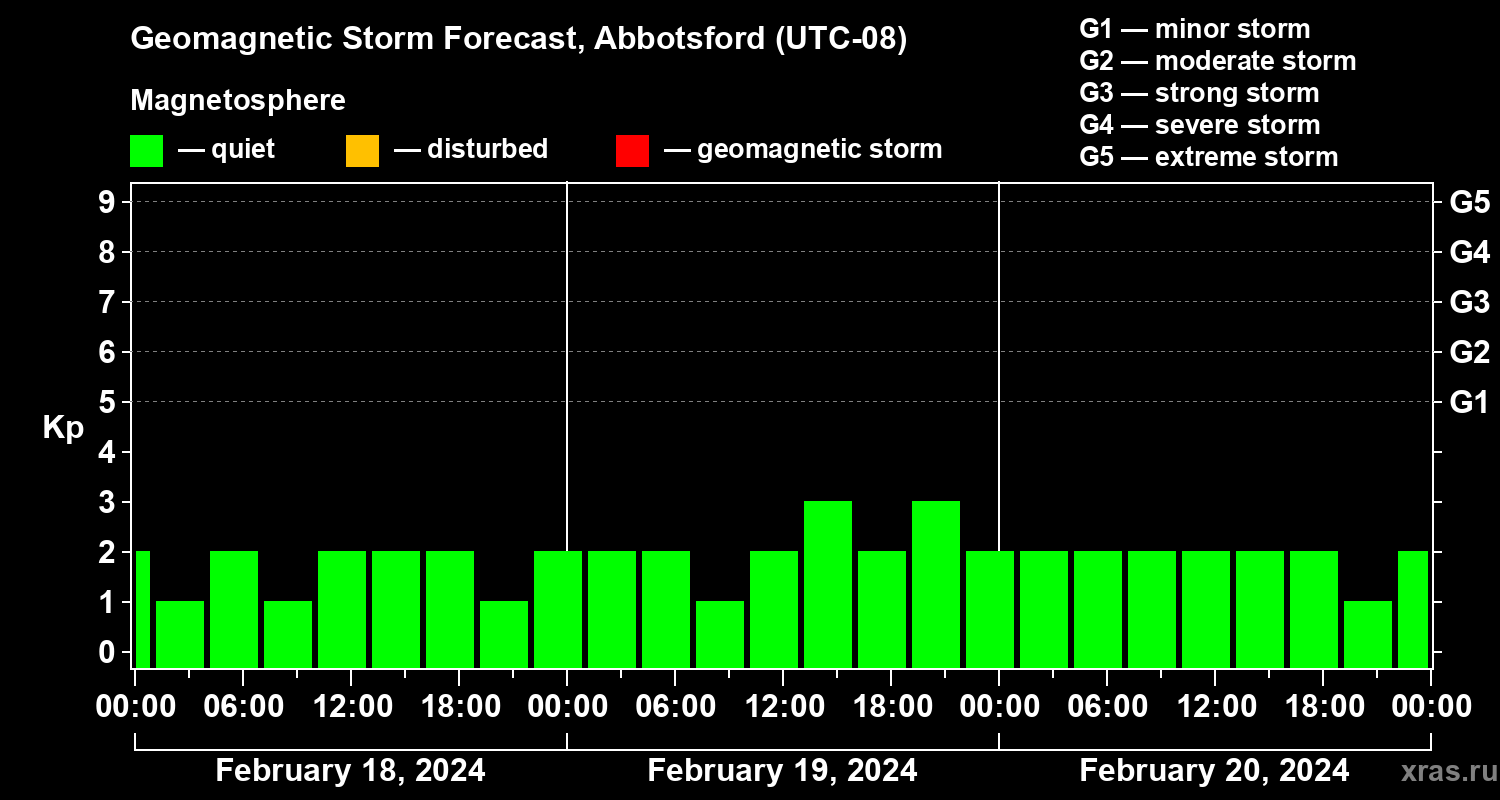 Geomagnetic storm forecast in Abbotsford for Feb 18, 2024