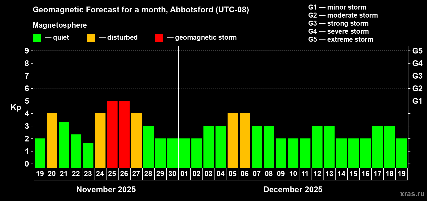 Geomagnetic storm forecast in Abbotsford for Nov 19, 2025