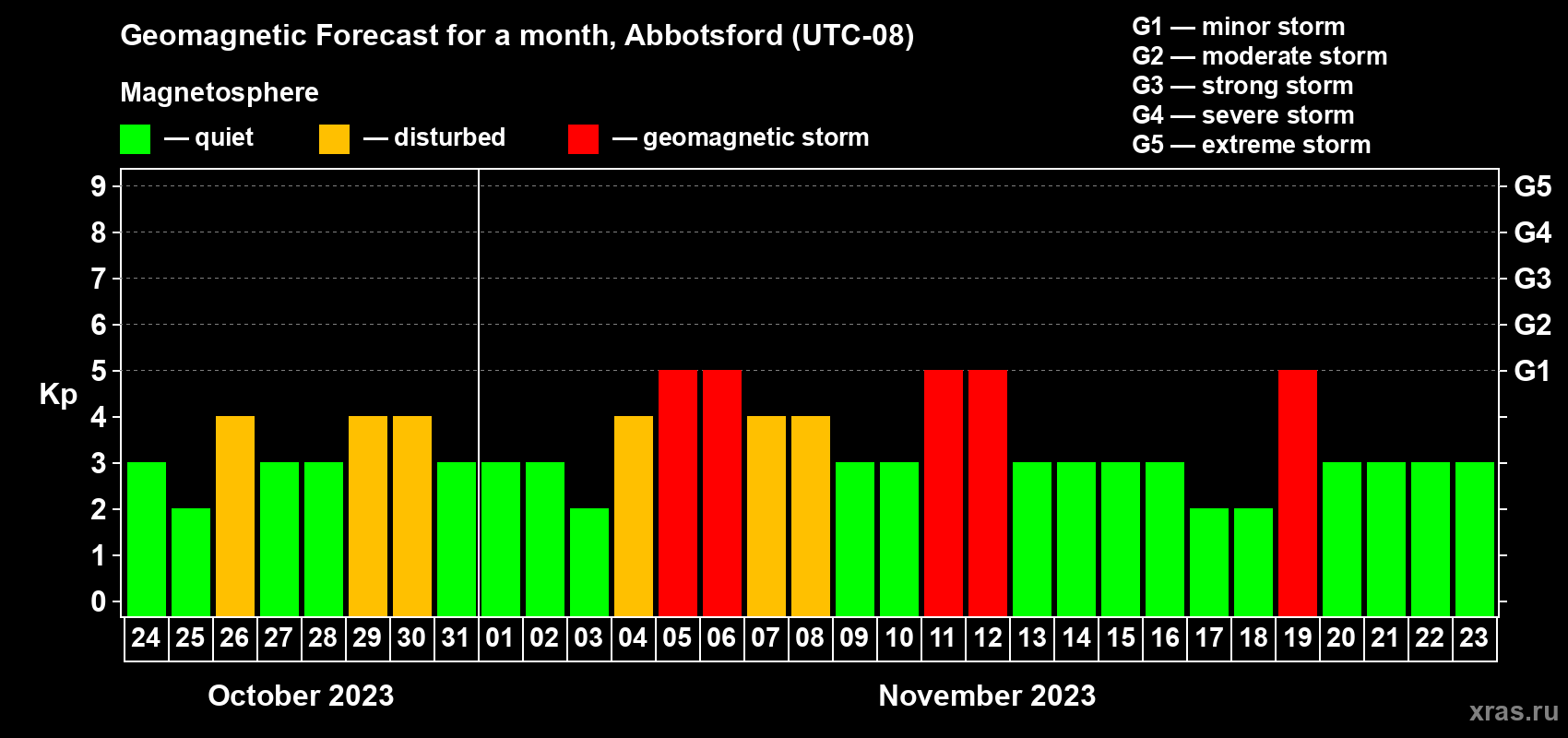 Geomagnetic storm forecast in Abbotsford for Oct 24, 2023