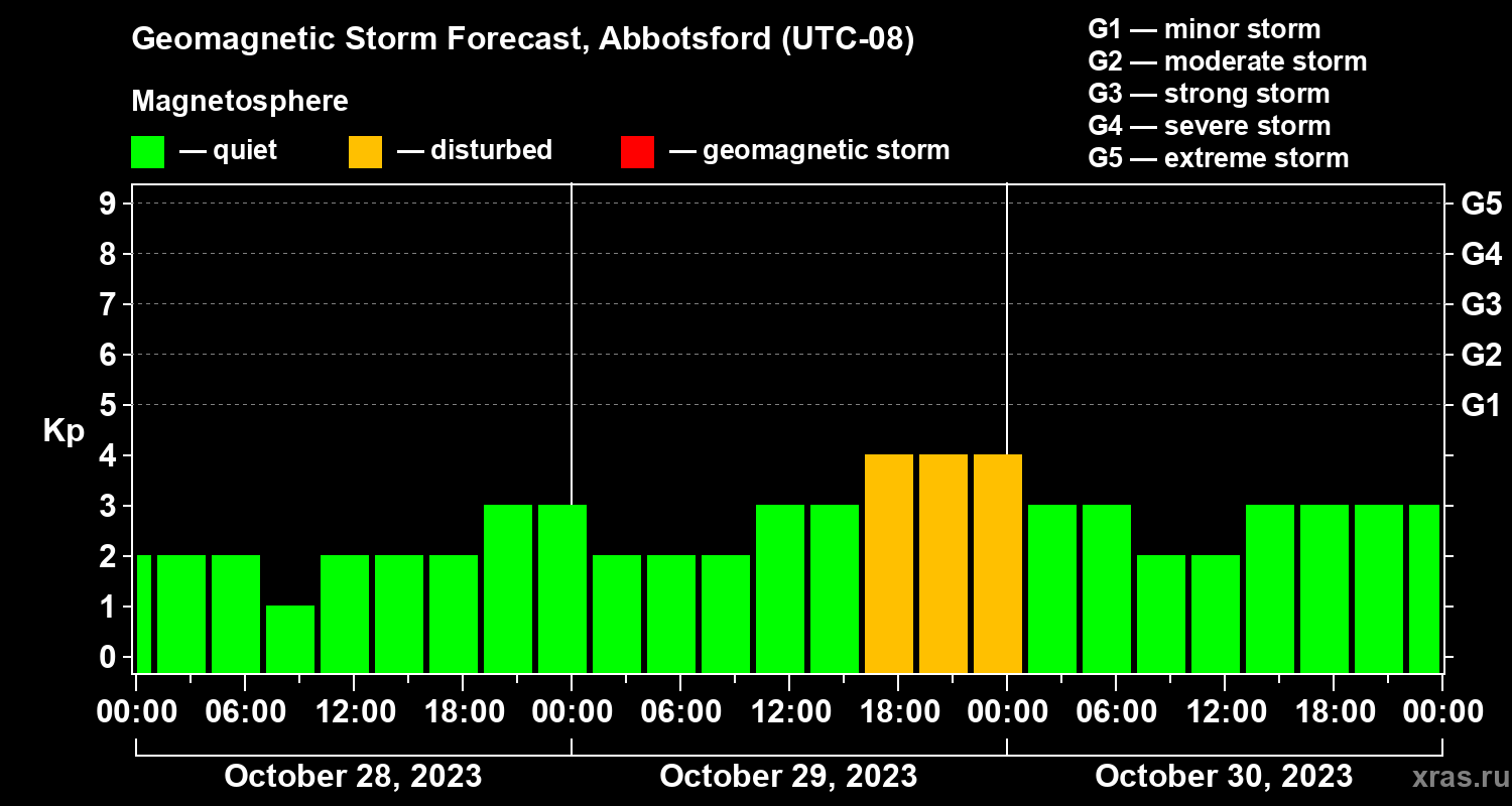 Geomagnetic storm forecast in Abbotsford for Oct 28, 2023