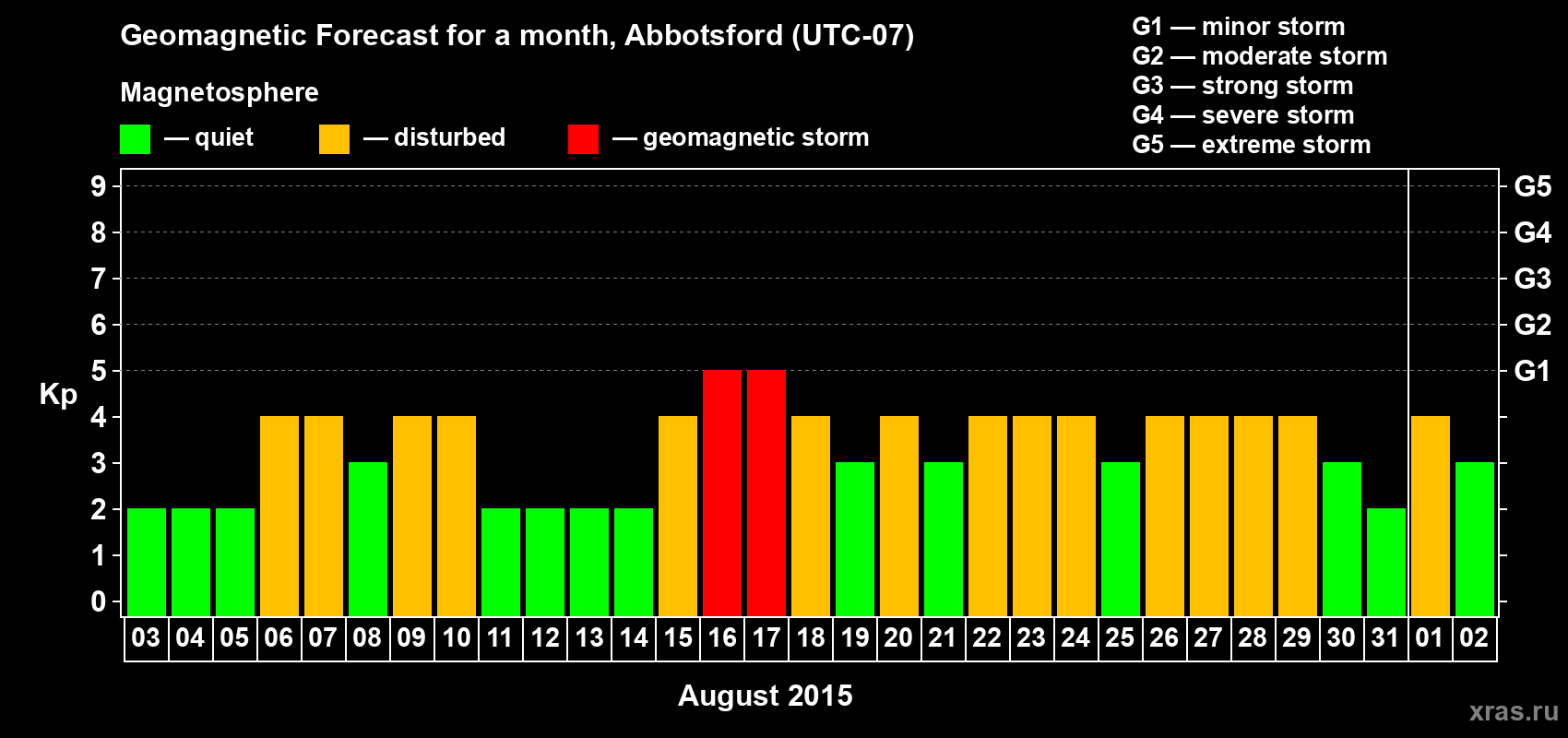 Geomagnetic storm forecast in Abbotsford for Aug 03, 2015