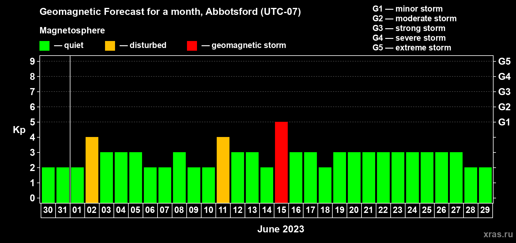 Geomagnetic storm forecast in Abbotsford for May 30, 2023