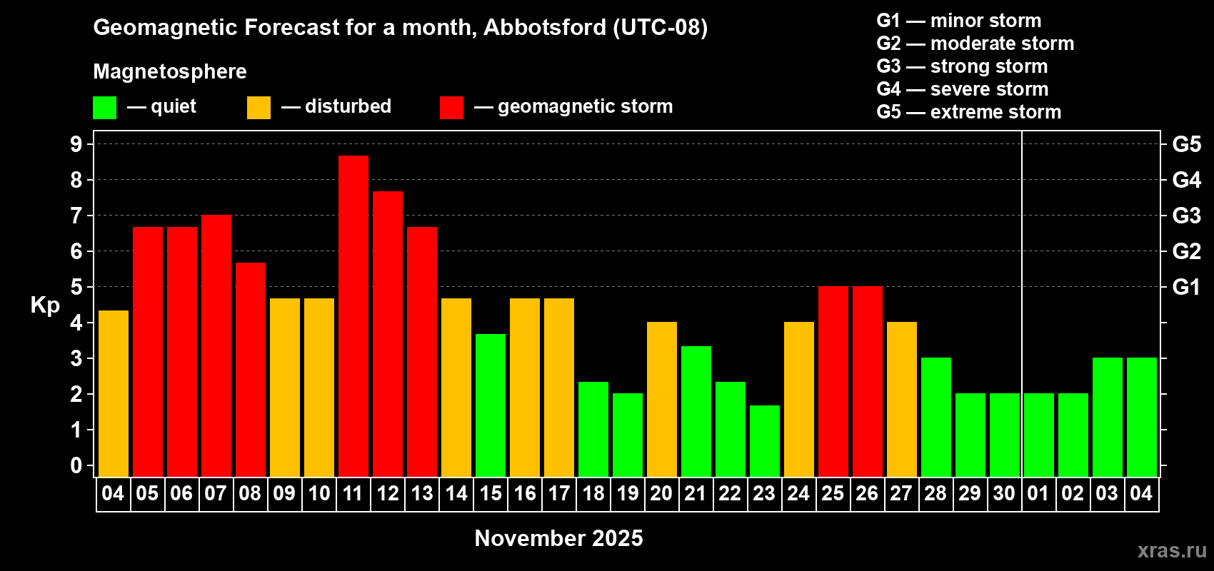 Geomagnetic storm forecast in Abbotsford for Nov 04, 2025