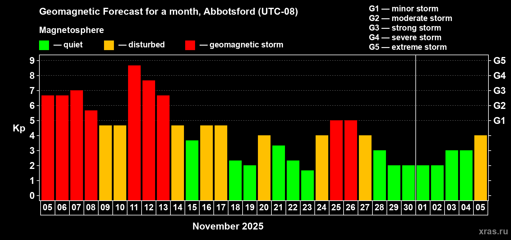 Geomagnetic storm forecast in Abbotsford for Nov 05, 2025