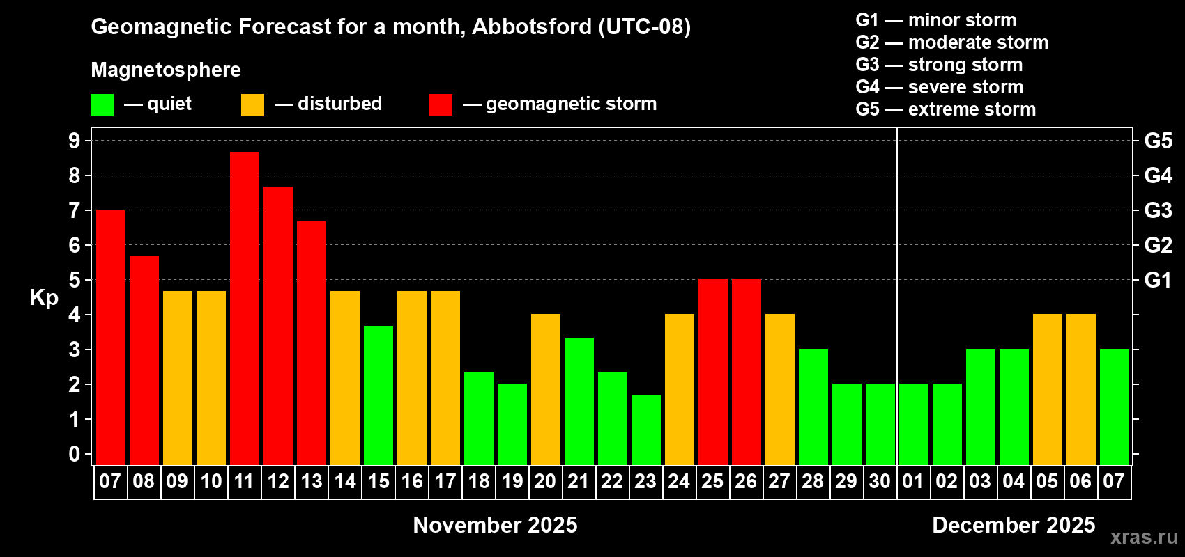 Geomagnetic storm forecast in Abbotsford for Nov 07, 2025