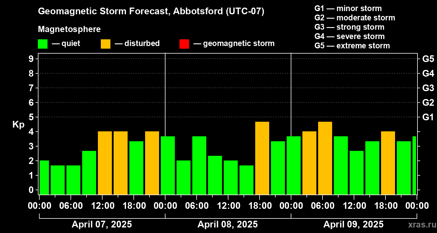 Geomagnetic storm forecast in Abbotsford for Apr 07, 2025