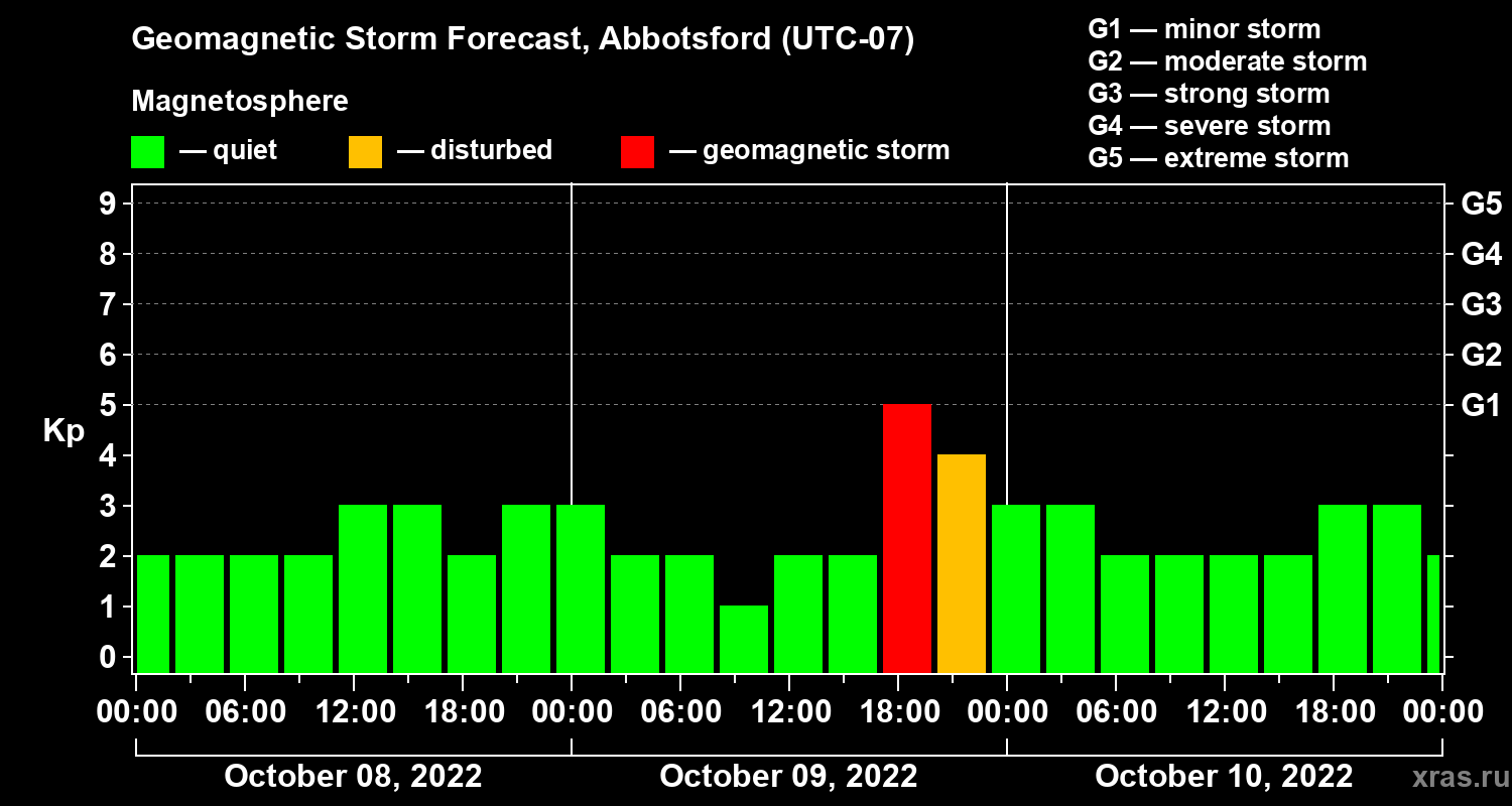 Geomagnetic storm forecast in Abbotsford for Oct 08, 2022