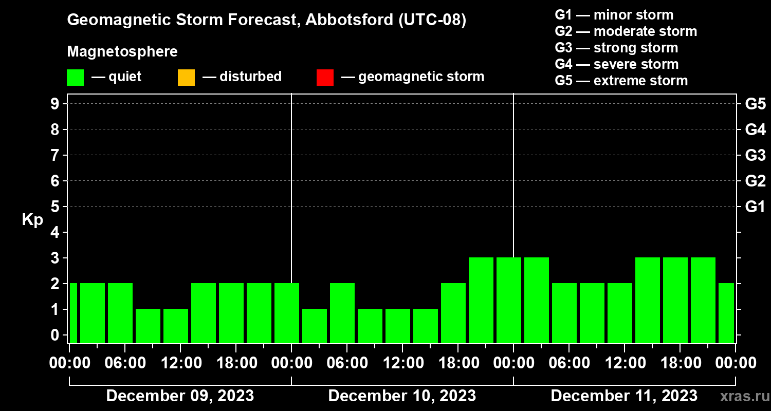 Geomagnetic storm forecast in Abbotsford for Dec 09, 2023