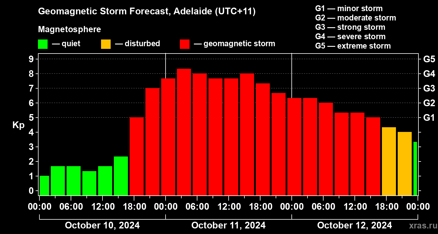 Geomagnetic storm forecast in Adelaide for Oct 10, 2024
