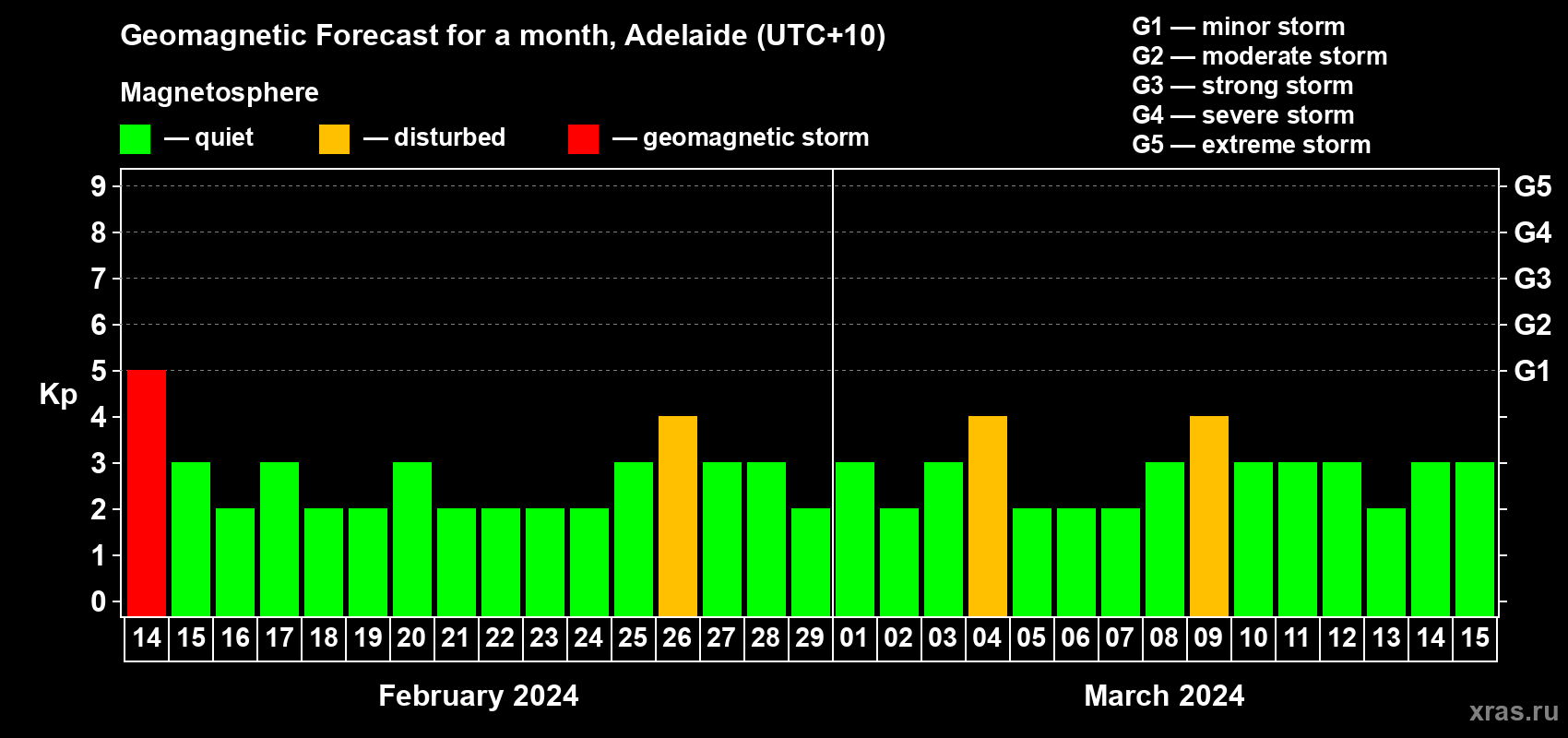 Geomagnetic storm forecast in Adelaide for Feb 14, 2024