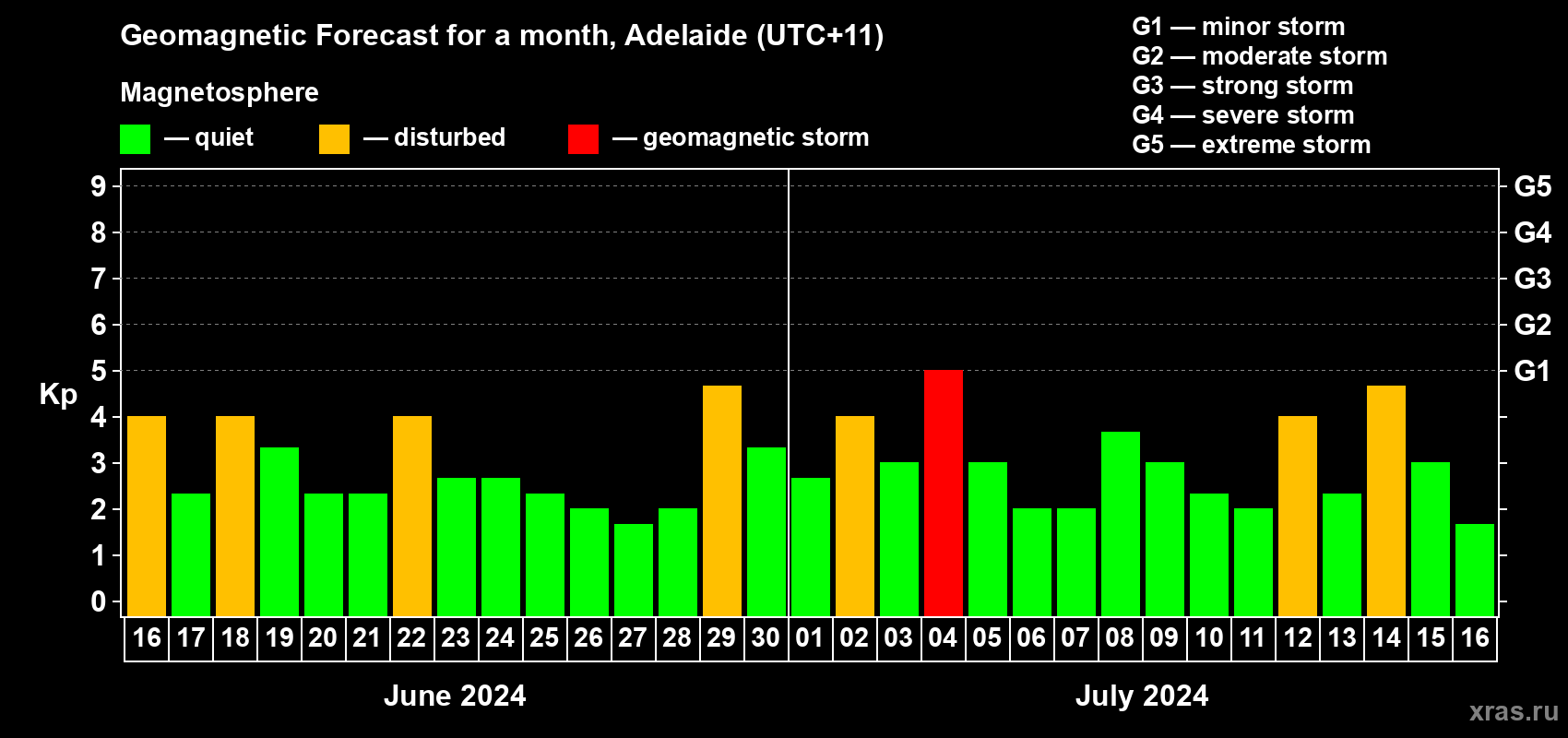 Geomagnetic storm forecast in Adelaide for Jun 16, 2024