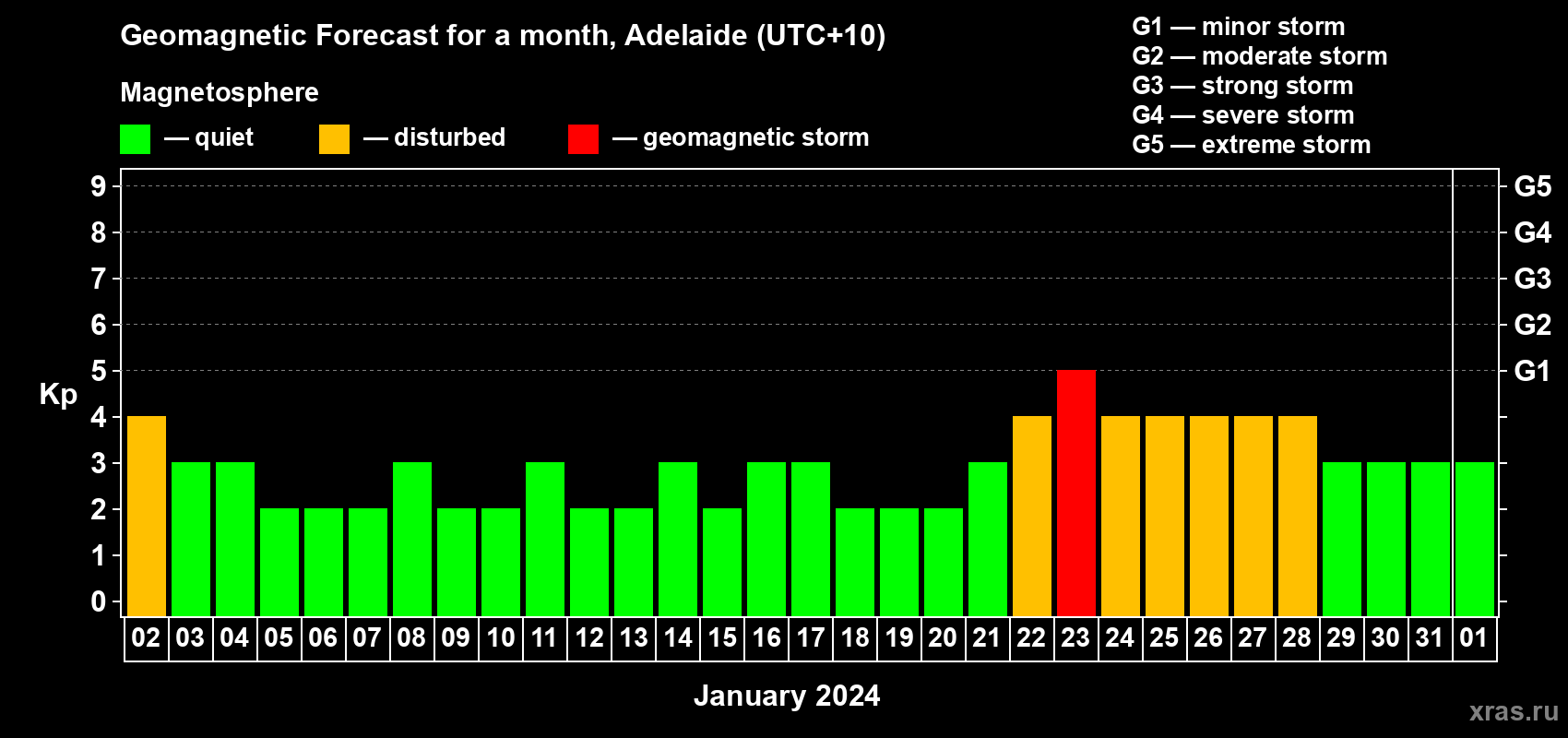 Geomagnetic storm forecast in Adelaide for Jan 02, 2024