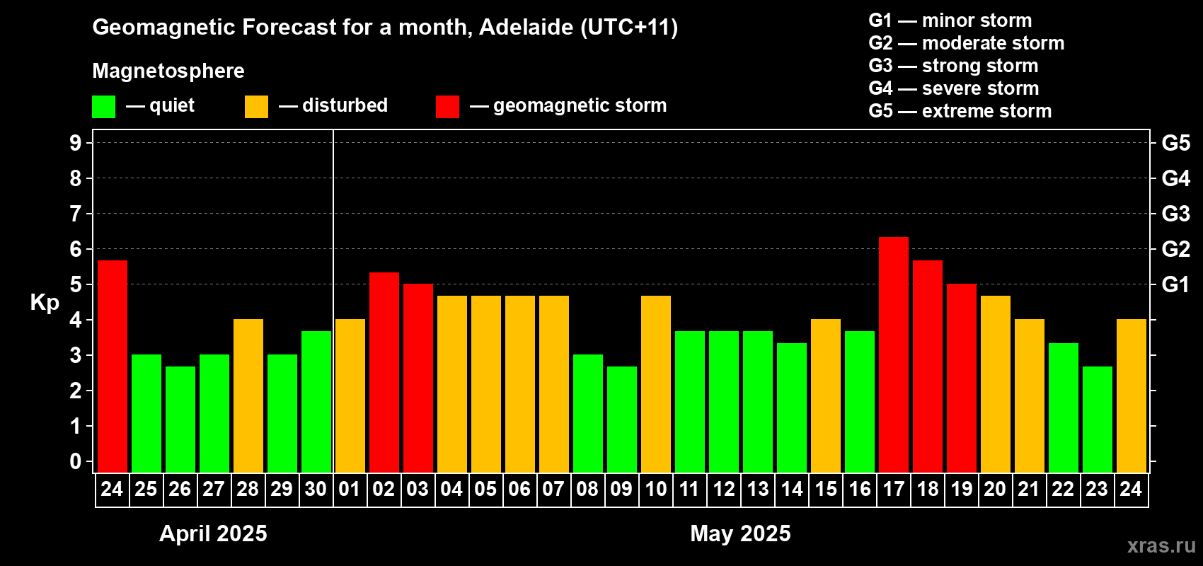 Geomagnetic storm forecast in Adelaide for Apr 24, 2025