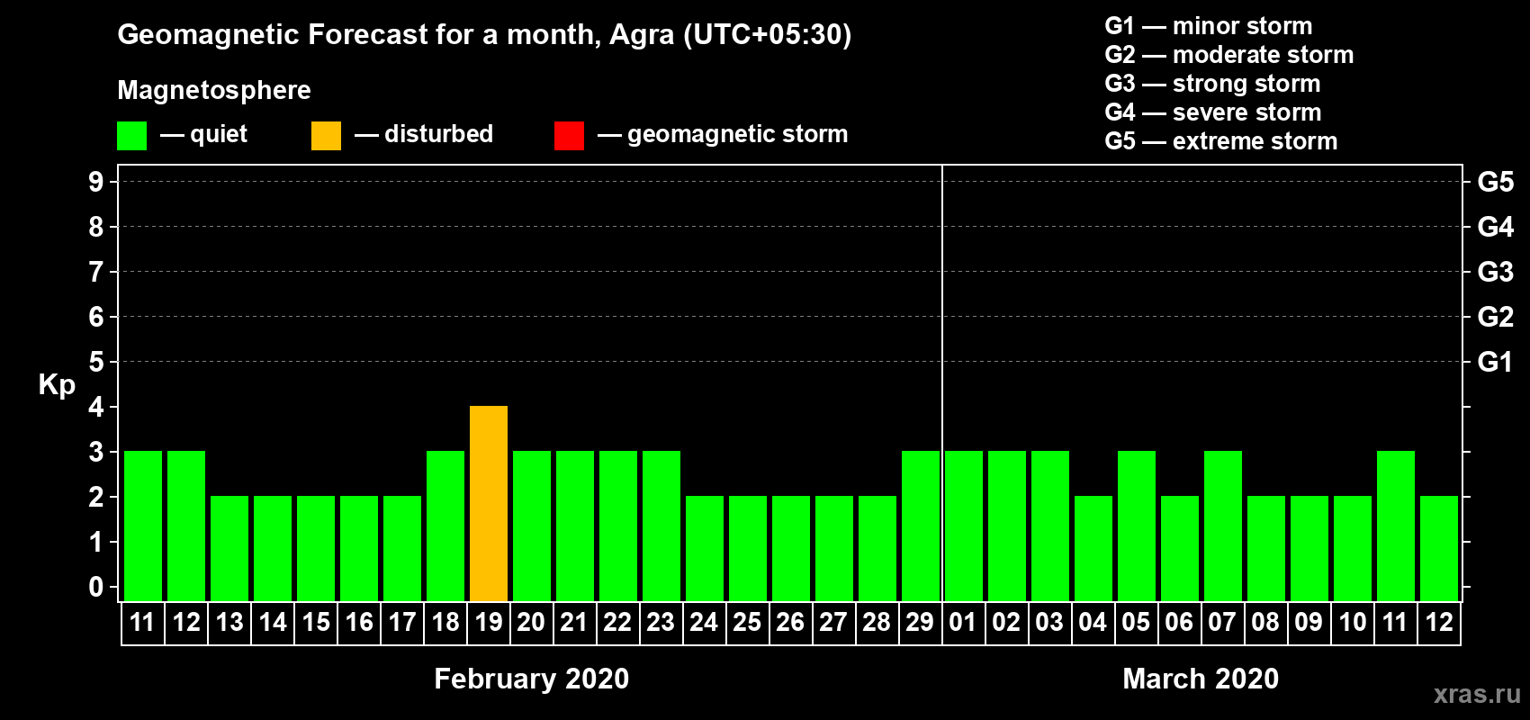 Geomagnetic storm forecast in Agra for Feb 11, 2020