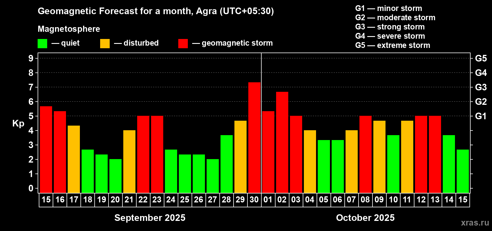 Geomagnetic storm forecast in Agra for Sep 15, 2025