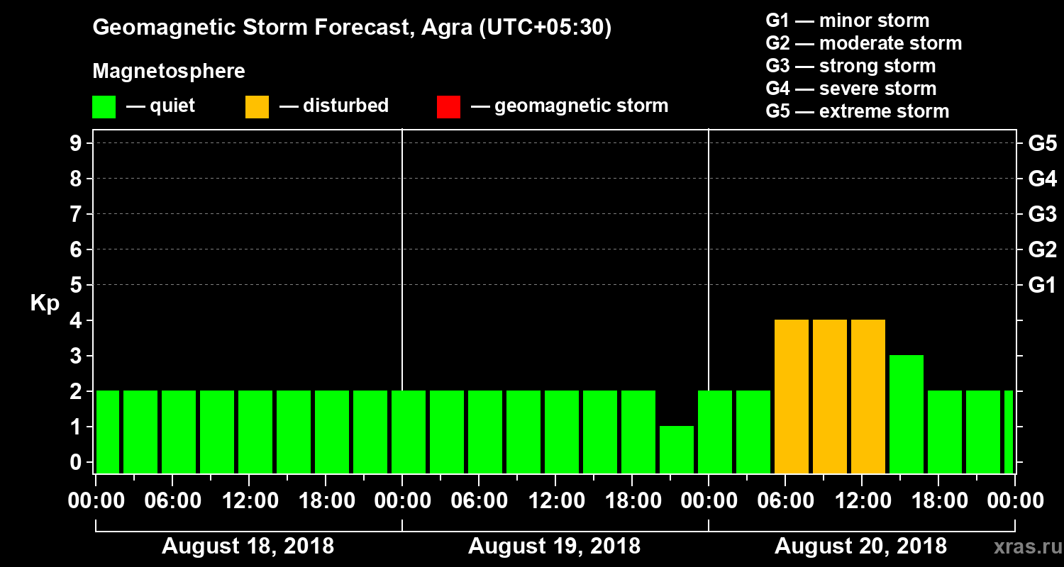 Geomagnetic storm forecast in Agra for Aug 18, 2018