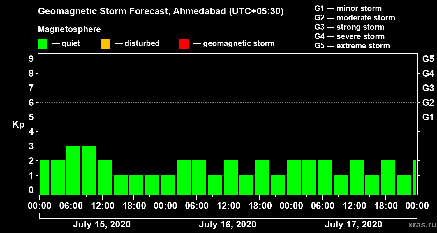 Geomagnetic storm forecast in Ahmedabad for Jul 15, 2020
