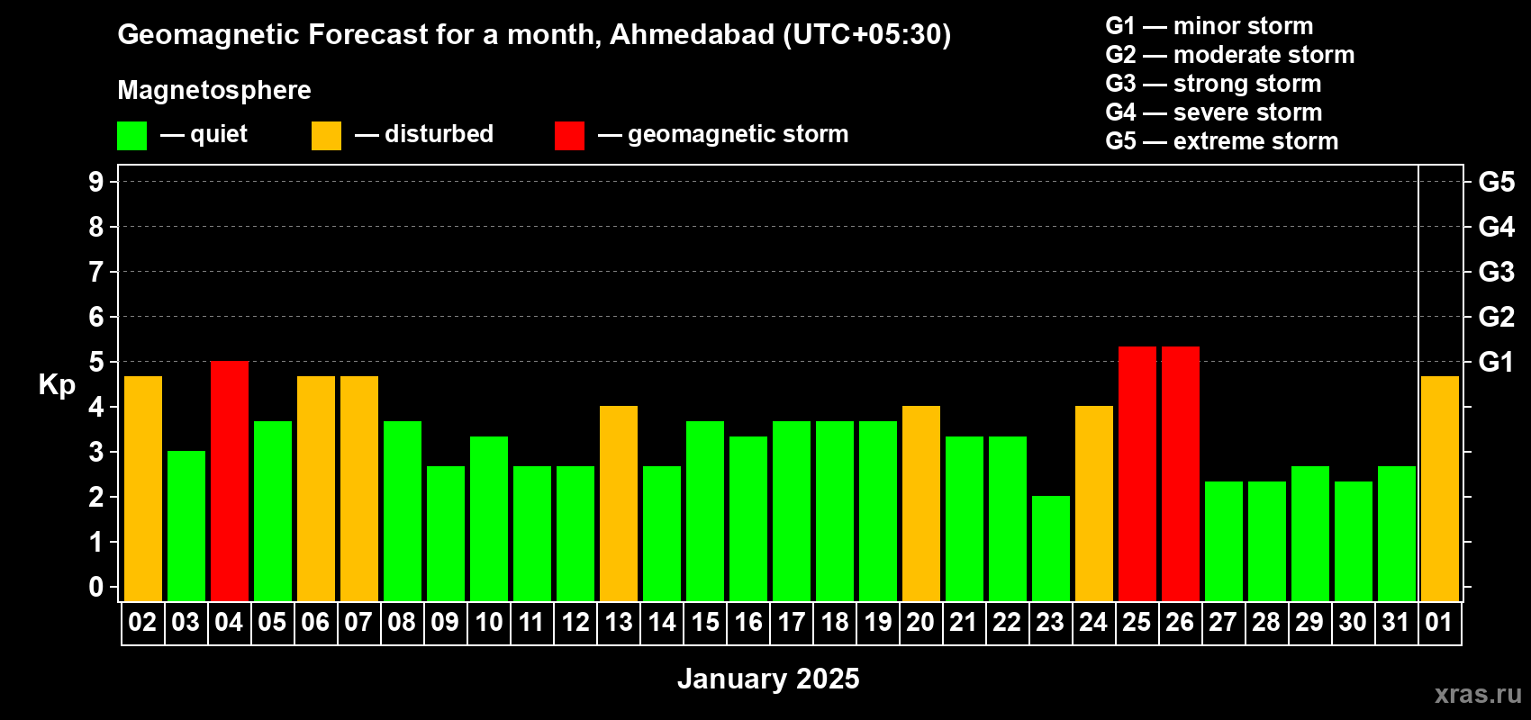 Geomagnetic storm forecast in Ahmedabad for Jan 02, 2025
