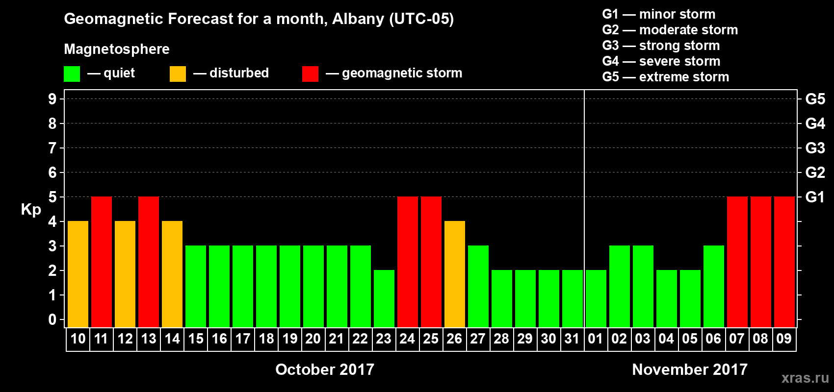 Geomagnetic storm forecast in Albany for Oct 10, 2017