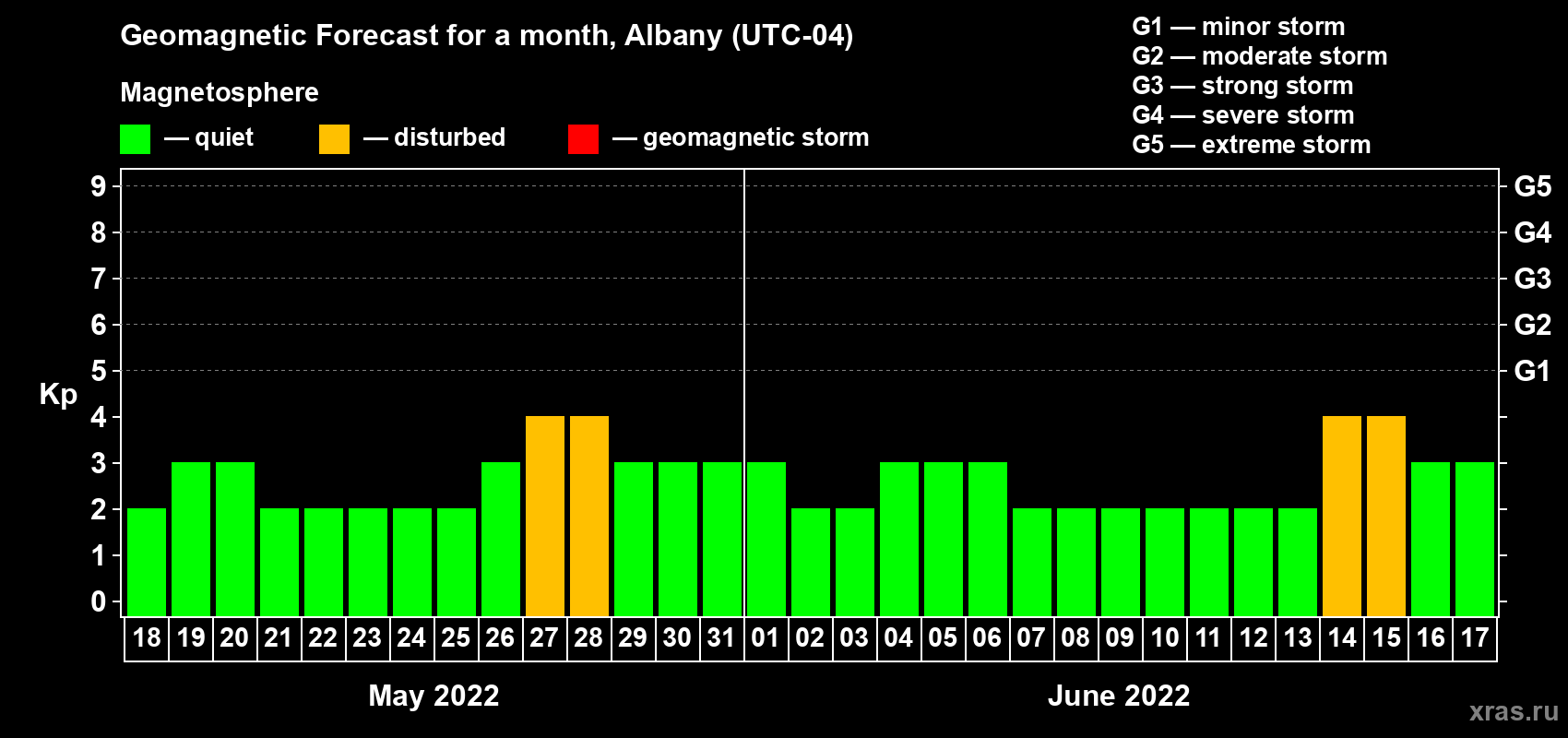 Geomagnetic storm forecast in Albany for May 18, 2022