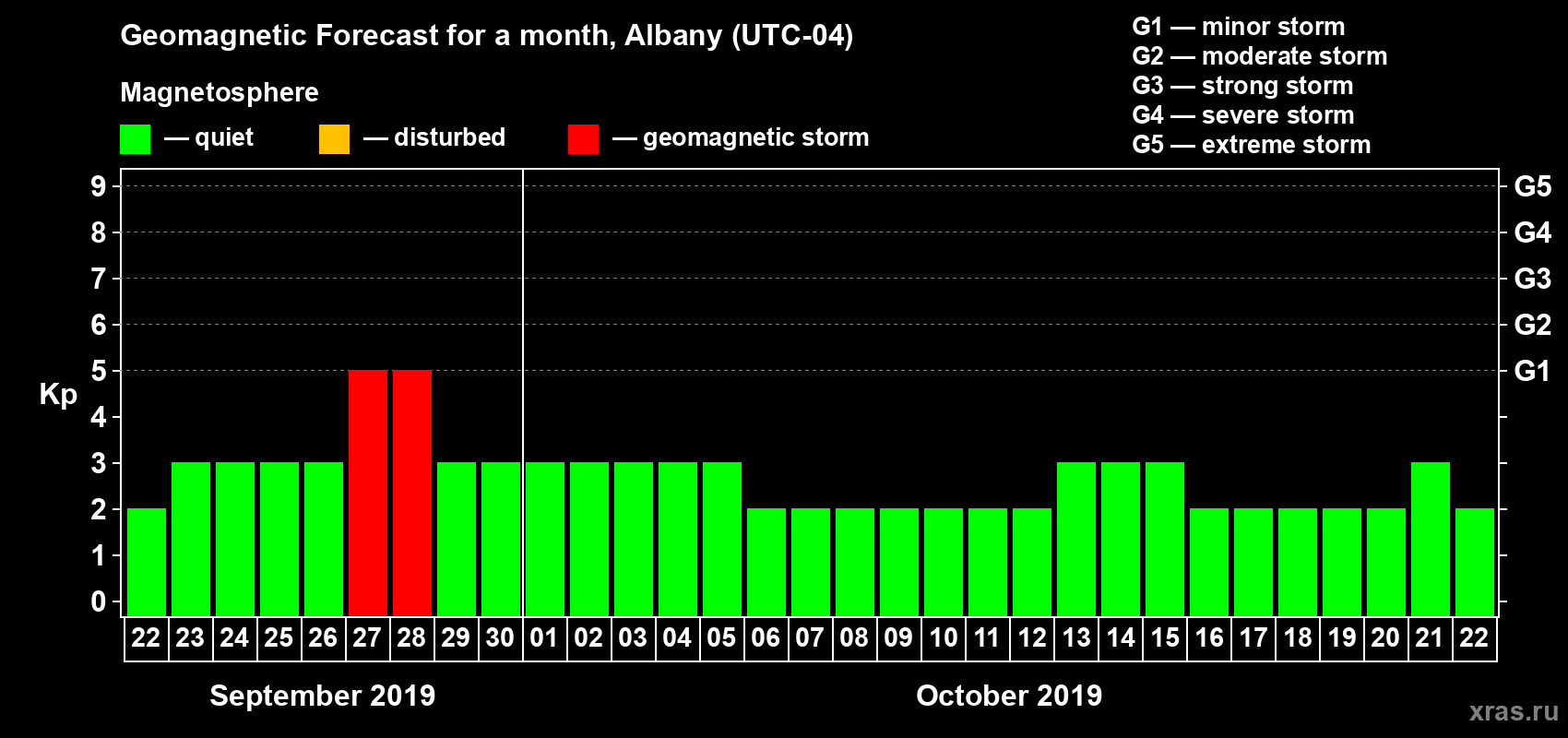 Geomagnetic storm forecast in Albany for Sep 22, 2019