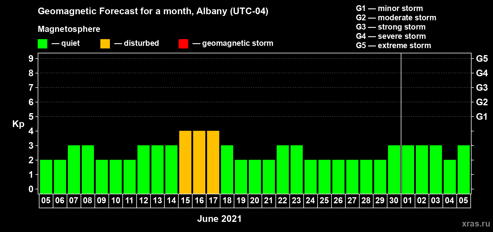 Geomagnetic storm forecast in Albany for Jun 05, 2021