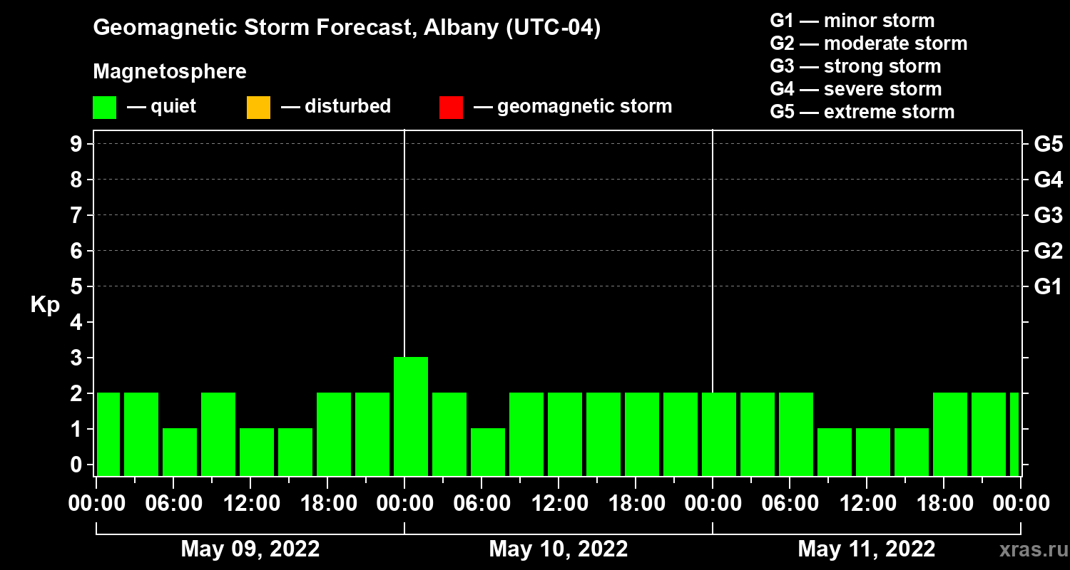 Geomagnetic storm forecast in Albany for May 09, 2022