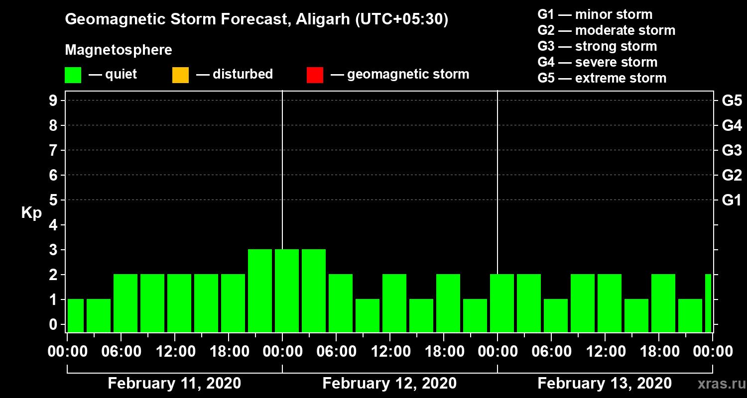 Geomagnetic storm forecast in Aligarh for Feb 11, 2020