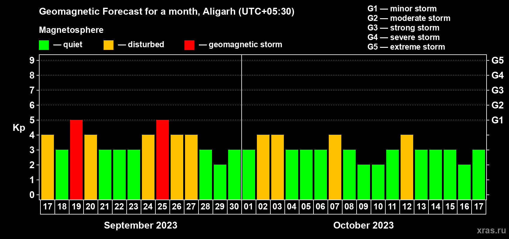 Geomagnetic storm forecast in Aligarh for Sep 17, 2023