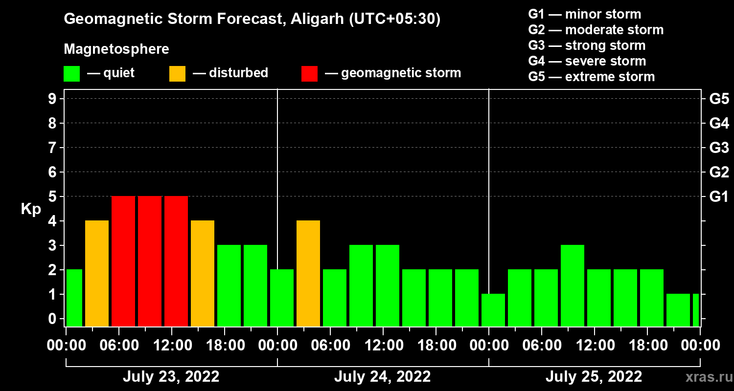 Geomagnetic storm forecast in Aligarh for Jul 23, 2022