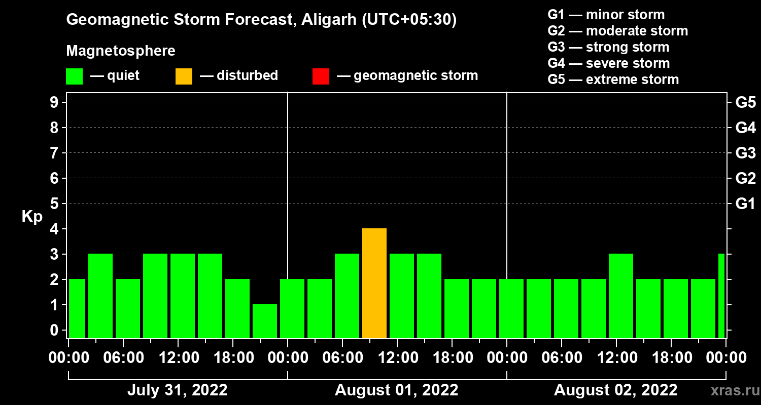 Geomagnetic storm forecast in Aligarh for Jul 31, 2022