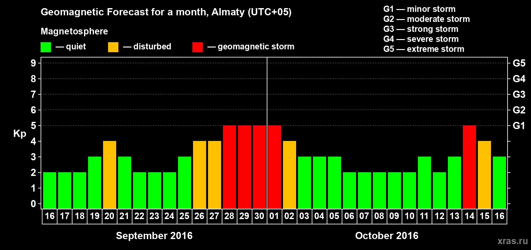 Geomagnetic storm forecast in Almaty for Sep 16, 2016