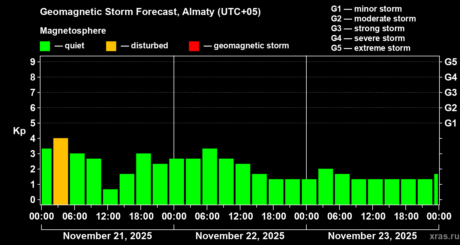 Geomagnetic storm forecast in Almaty for Nov 21, 2025