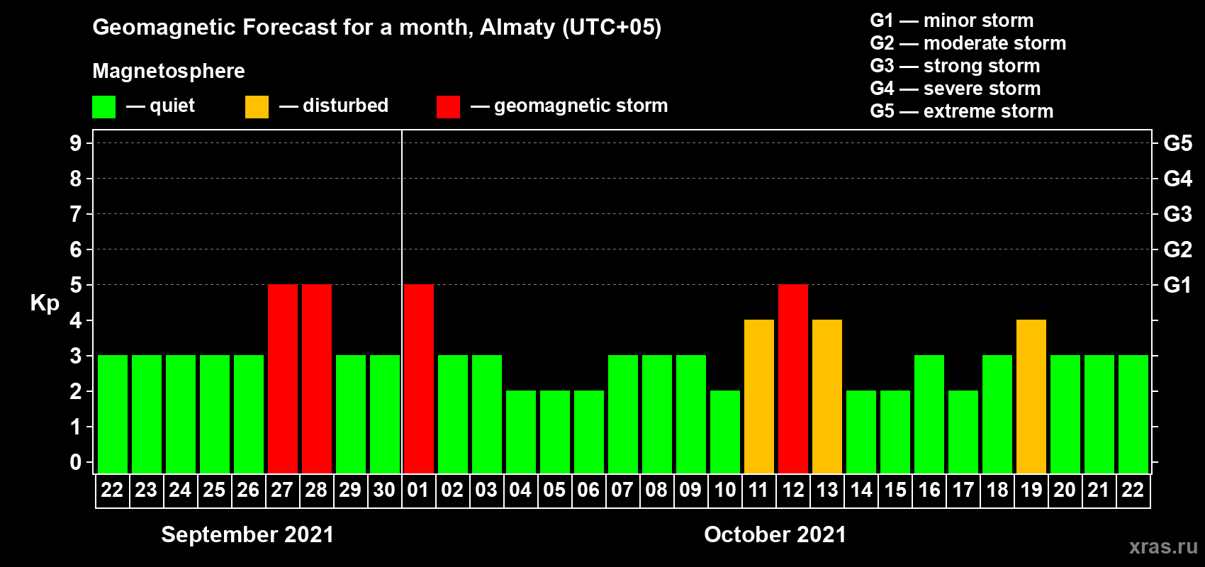 Geomagnetic storm forecast in Almaty for Sep 22, 2021