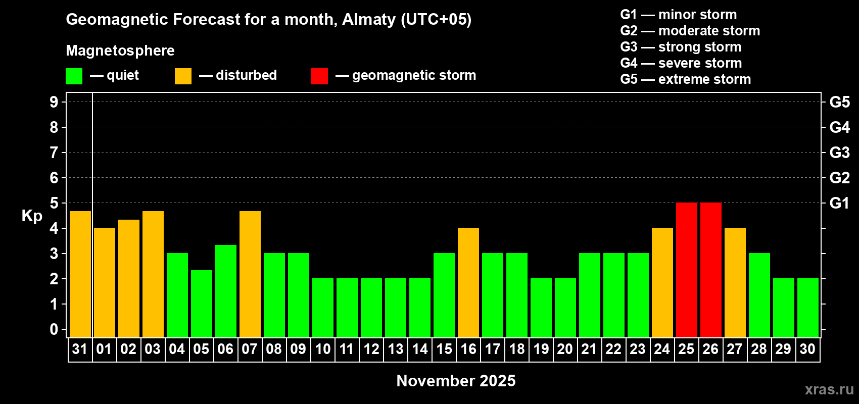 Geomagnetic storm forecast in Almaty for Oct 31, 2025