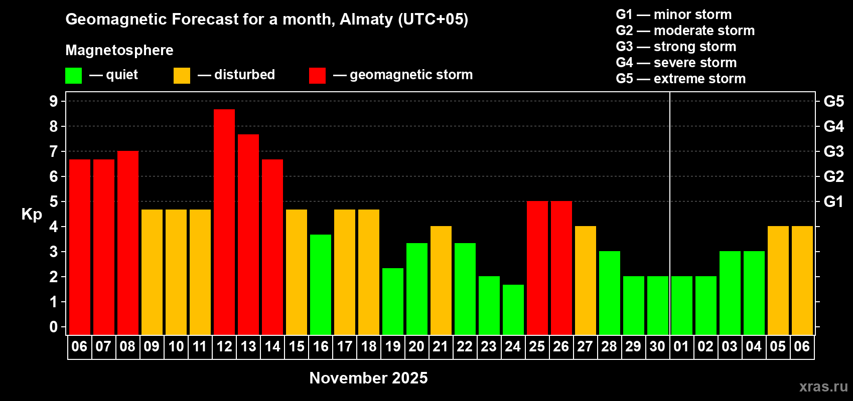 Geomagnetic storm forecast in Almaty for Nov 06, 2025
