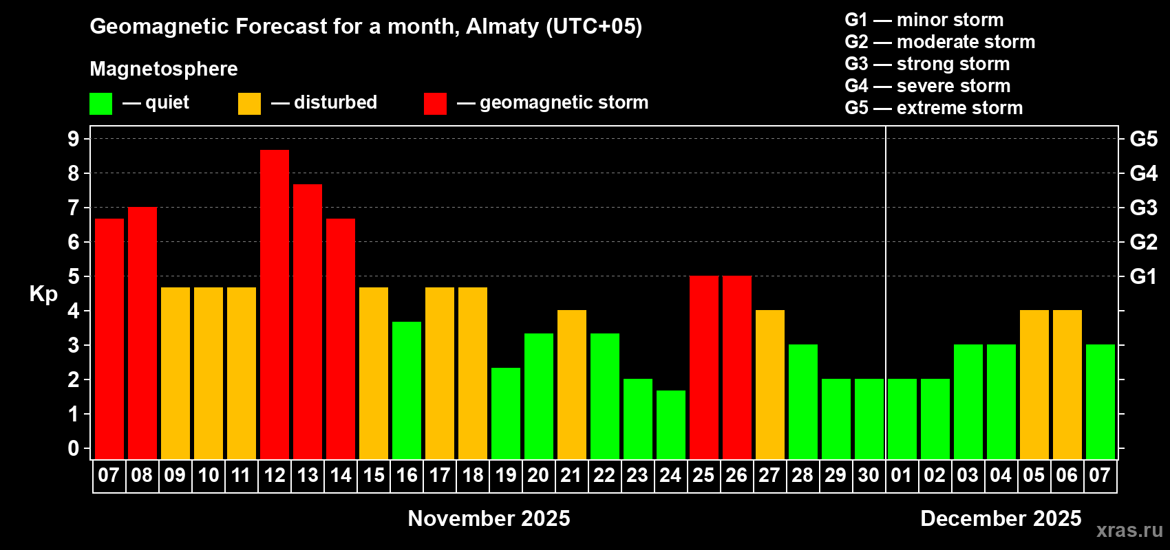 Geomagnetic storm forecast in Almaty for Nov 07, 2025