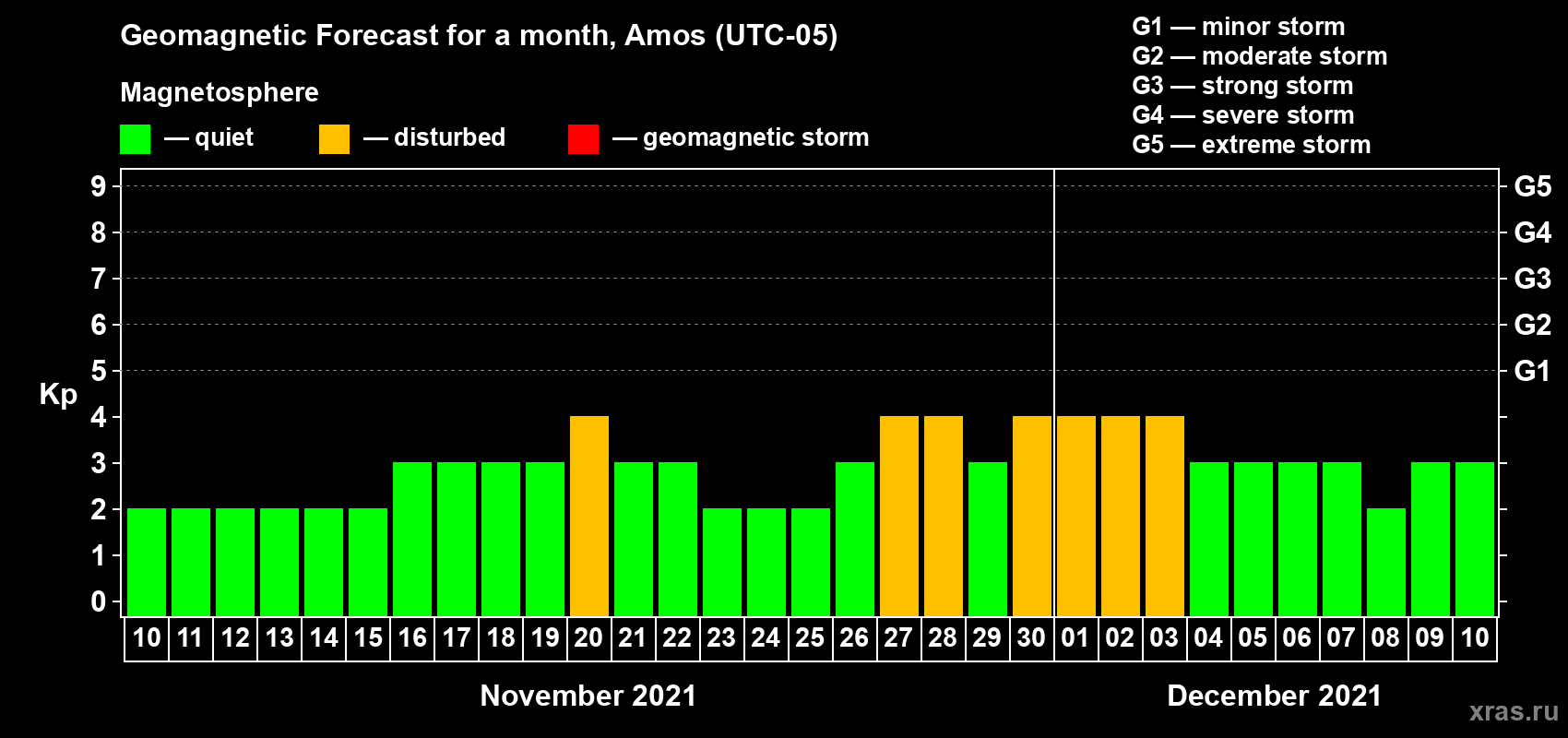 Geomagnetic storm forecast in Amos for Nov 10, 2021