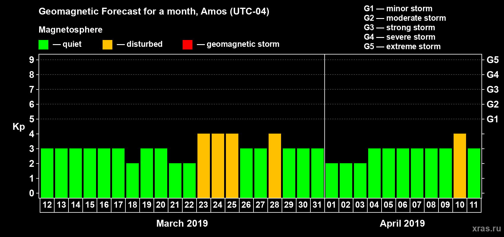 Geomagnetic storm forecast in Amos for Mar 12, 2019