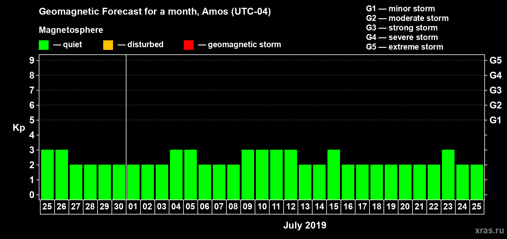 Geomagnetic storm forecast in Amos for Jun 25, 2019