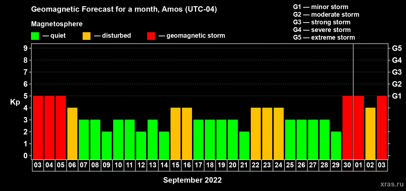 Geomagnetic storm forecast in Amos for Sep 03, 2022