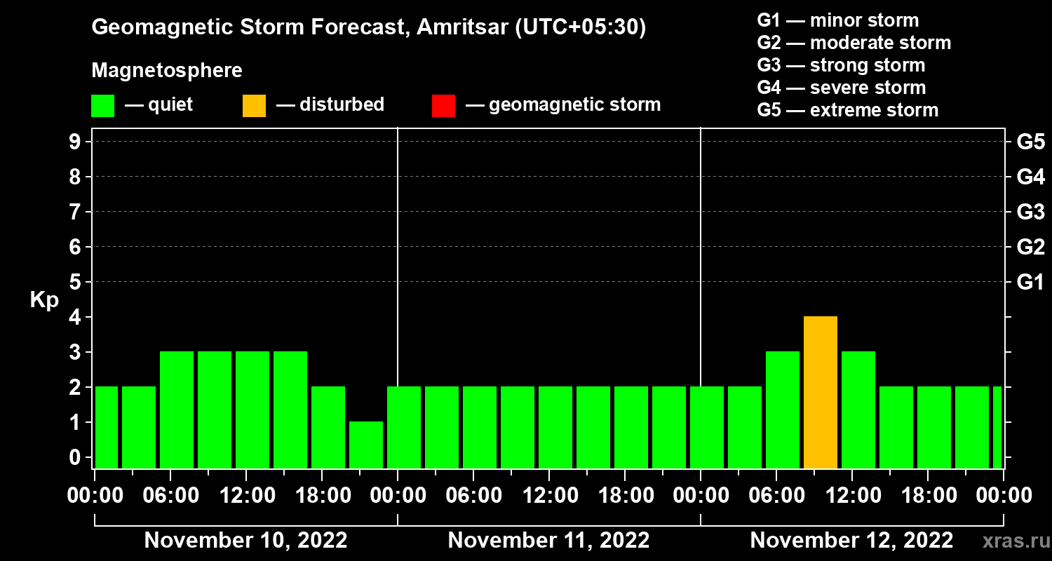 Geomagnetic storm forecast in Amritsar for Nov 10, 2022