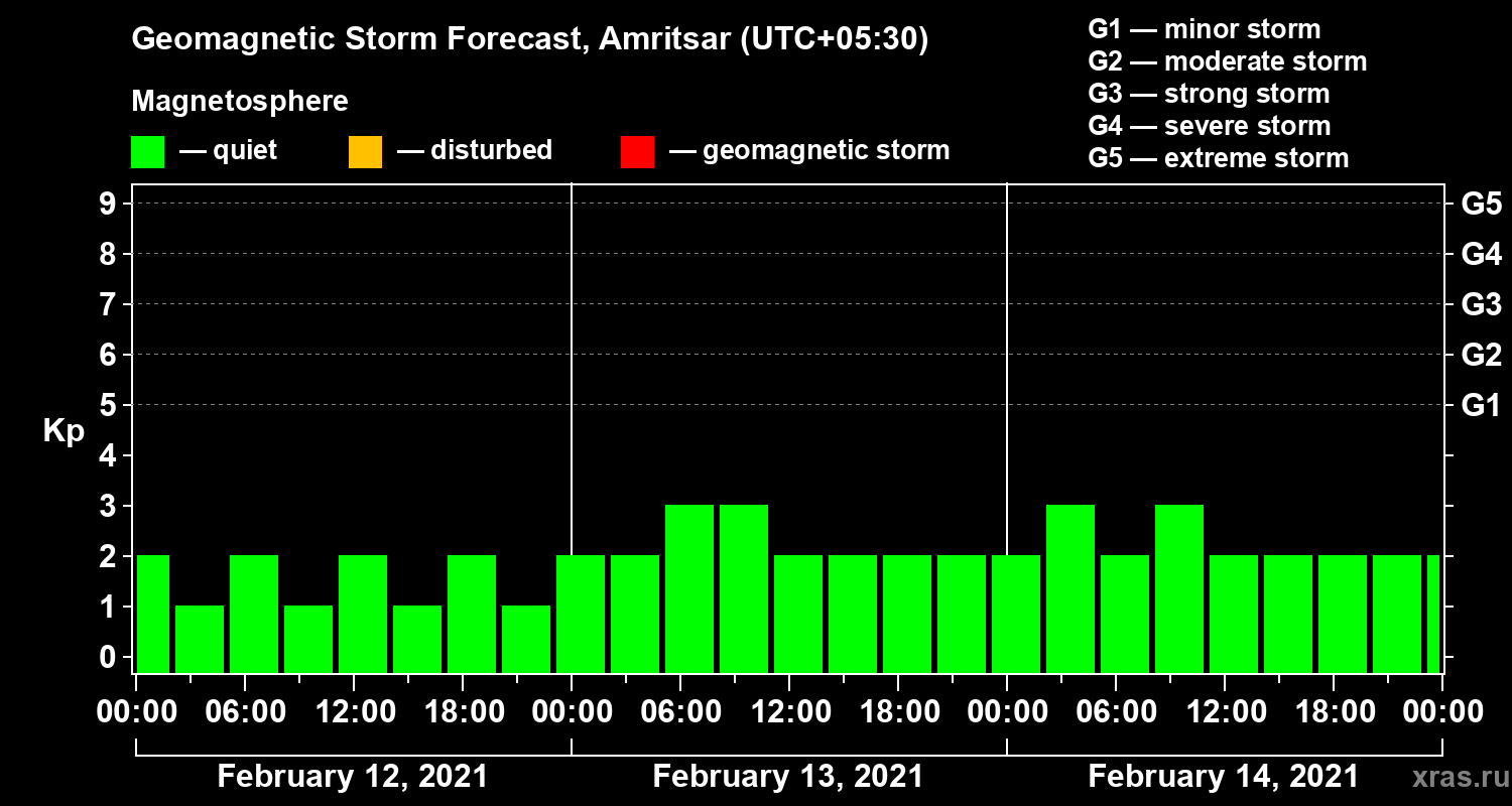 Geomagnetic storm forecast in Amritsar for Feb 12, 2021