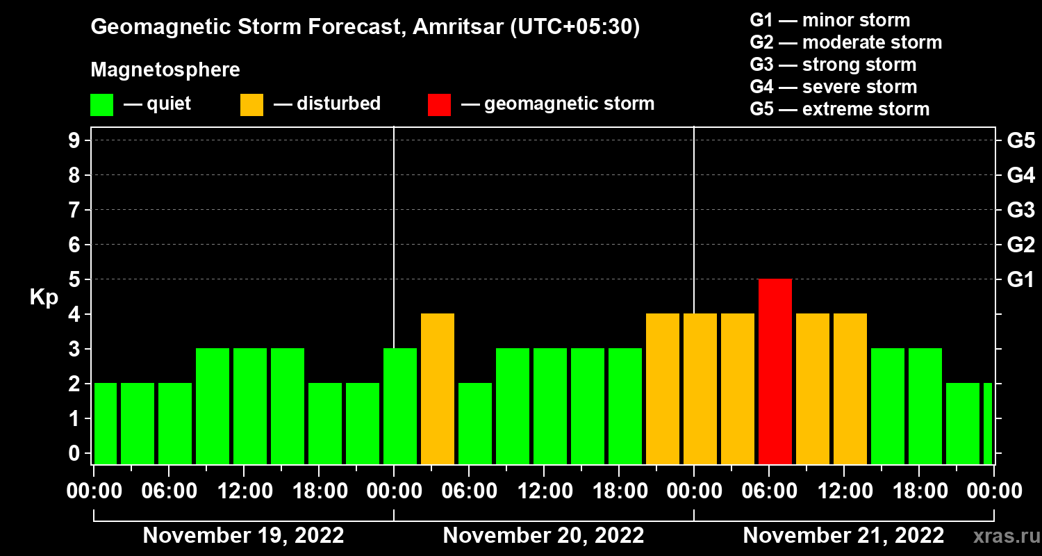 Geomagnetic storm forecast in Amritsar for Nov 19, 2022