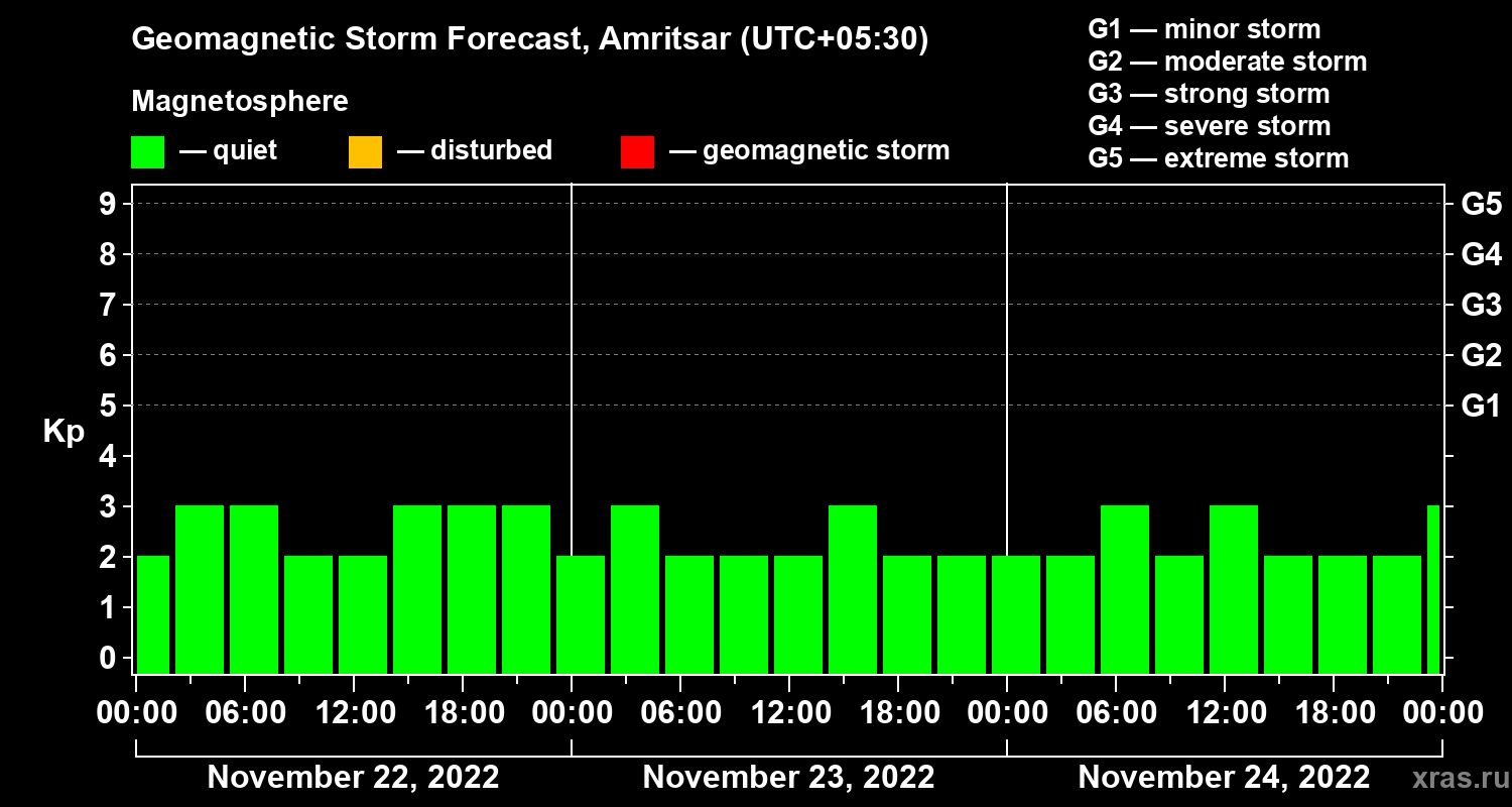 Geomagnetic storm forecast in Amritsar for Nov 22, 2022