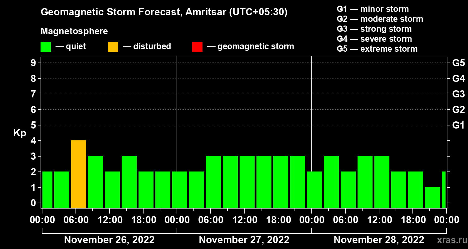 Geomagnetic storm forecast in Amritsar for Nov 26, 2022