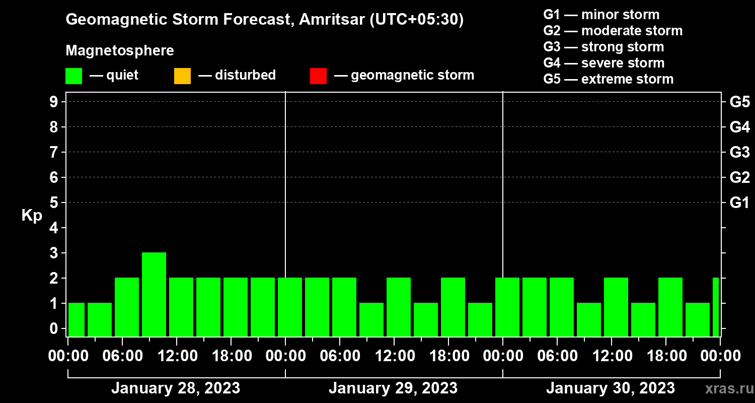 Geomagnetic storm forecast in Amritsar for Jan 28, 2023