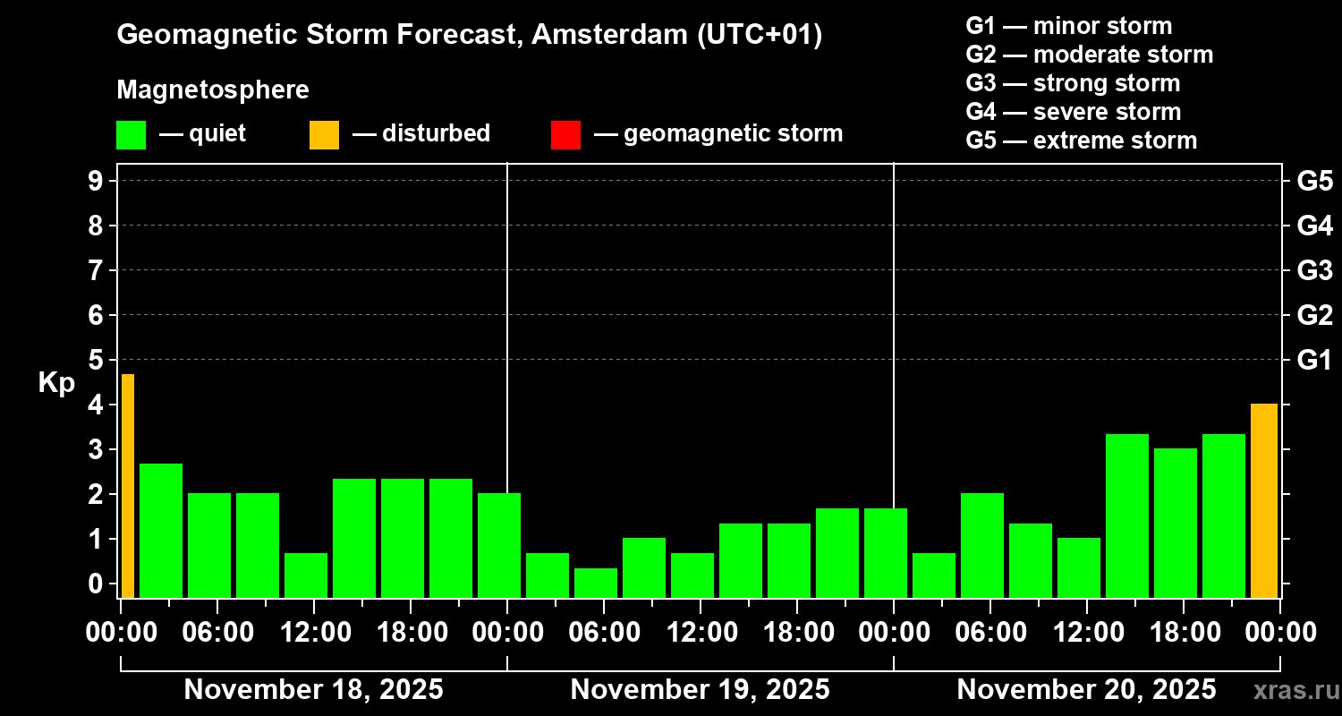 Geomagnetic storm forecast in Amsterdam for Nov 18, 2025